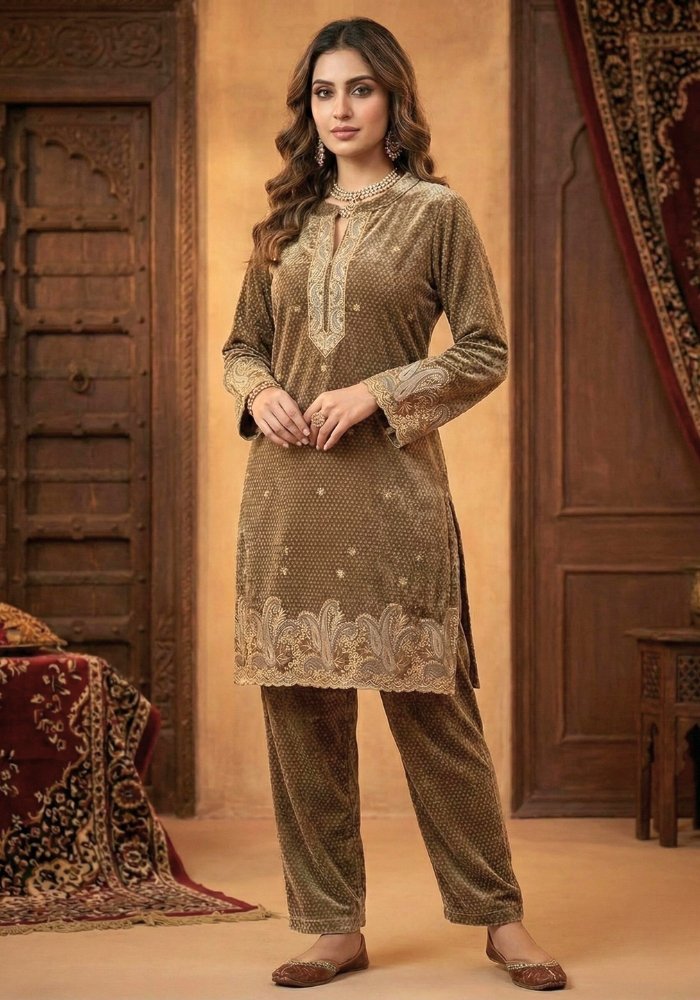 Velvet Coord Set with Embroidered Detailing (Golden Brown)