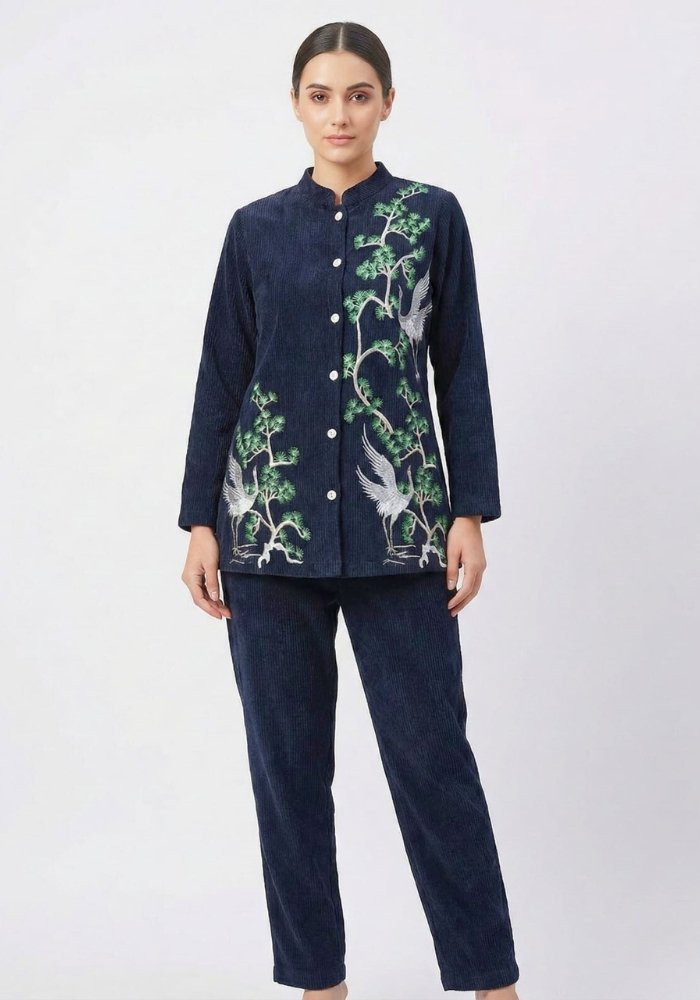 Velvet Co-ord Set with Resham Embroidery – Blue Color