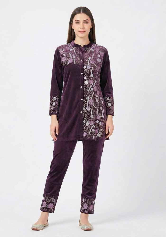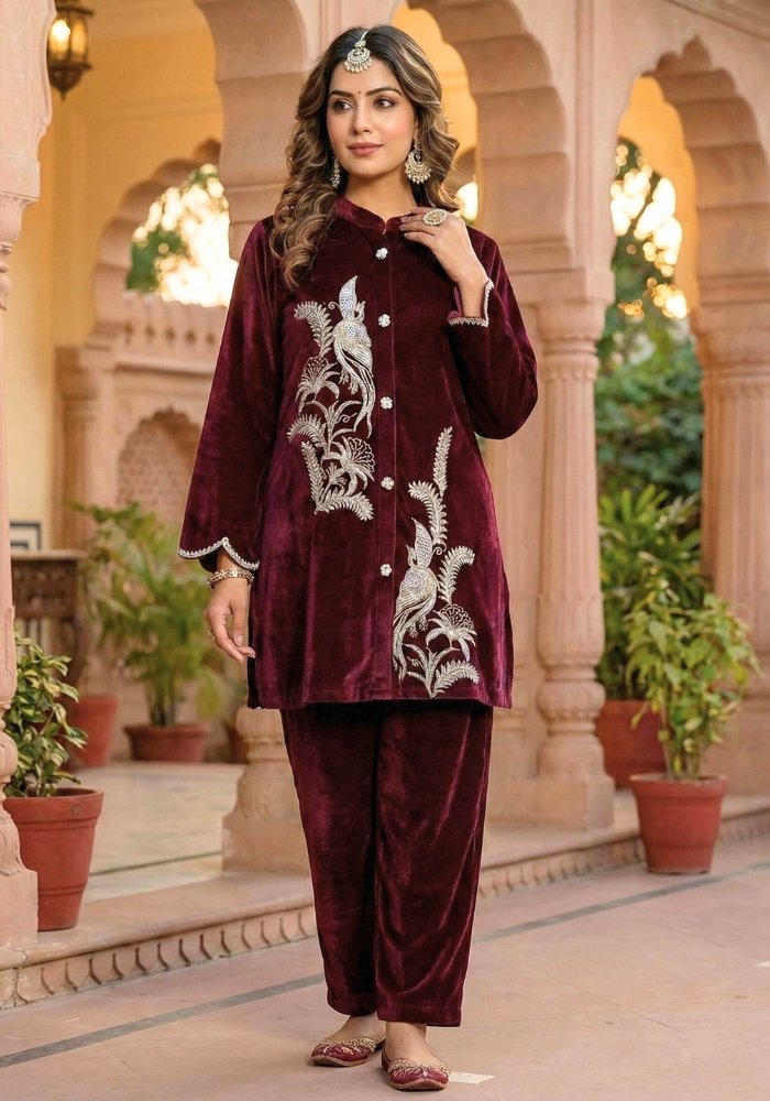 Velvet Co-ord Set with Resham Embroidery – Wine Color