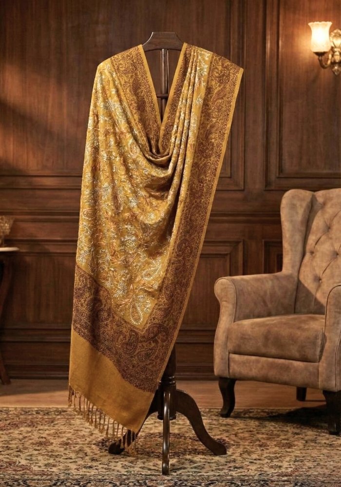 PURE WOOL HEAVY ZARDOZI EMBROIDERY MIRAYA SHAWL (MUSTARD GOLD)
