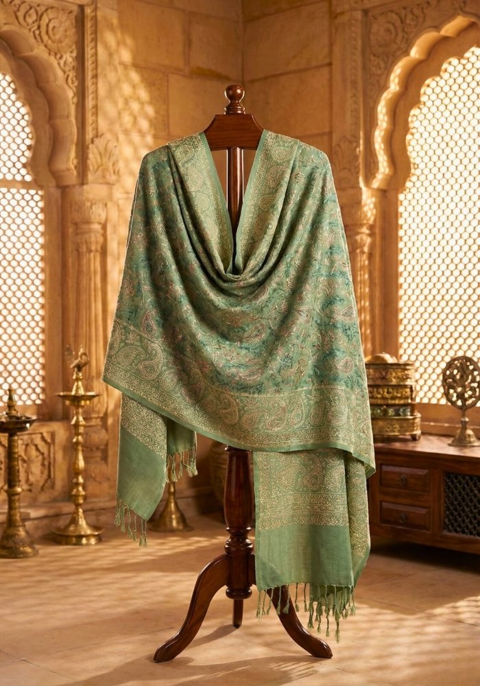 PURE WOOL HEAVY ZARDOZI EMBROIDERY MIRAYA SHAWL (SAGE GREEN)