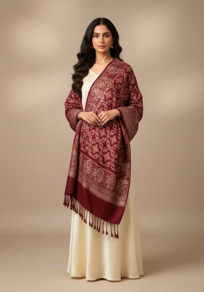 PURE WOOL HEAVY ZARDOZI EMBROIDERY MIRAYA SHAWL WINE MAROON
