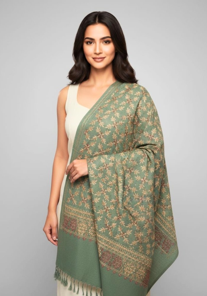 Jannat 2 Embroidered Full Kashmiri Jaal Wool Shawl Sage Green & Antique Gold