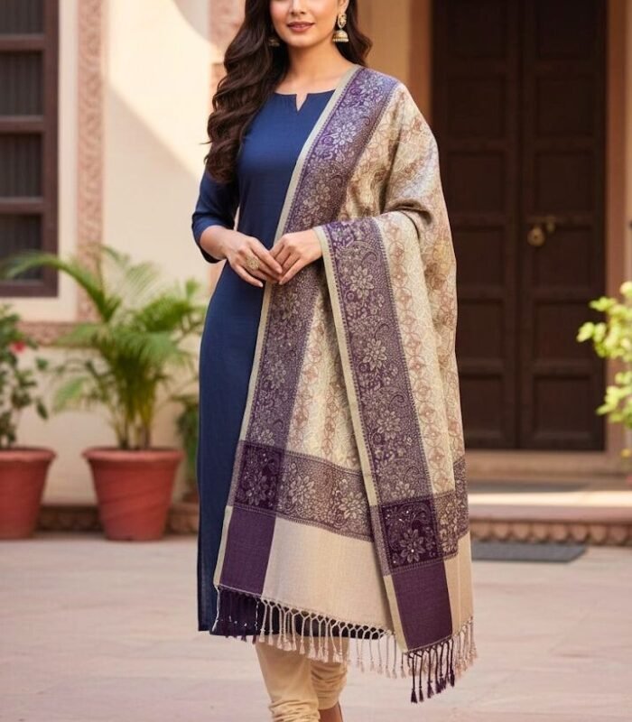 Full Kashmiri Aurilia Embroidery Shawl Ivory & Royal Plum