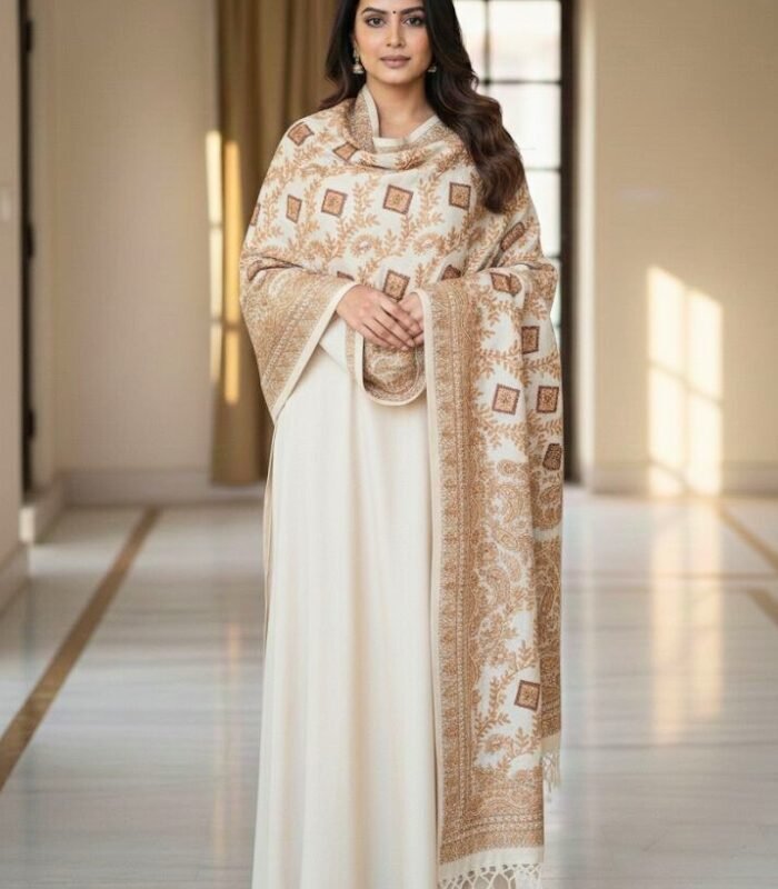 Pure Wool Heavy Embroidery Akshita Wool Shawl Ivory Beige Zardozi Detailing