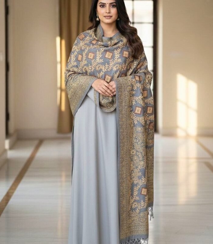 Pure Wool Heavy Embroidery Akshita Wool Shawl Muted Grey Blue with Zardozi Detailing
