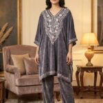 The rich grey base paired with intricate embroidery creates a graceful, timeless look. Designed for comfort and style, the relaxed silhouette drapes beautifully on all body types. Complete with matching straight-fit bottoms and coordinated earrings, this co-ord set is perfect for festive gatherings, evening wear, and elegant winter styling.