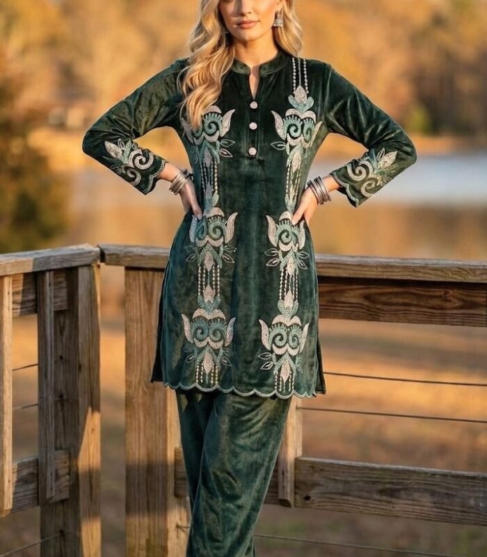 The rich grey base paired with intricate embroidery creates a graceful, timeless look. Designed for comfort and style, the relaxed silhouette drapes beautifully on all body types. Complete with matching straight-fit bottoms and coordinated earrings, this co-ord set is perfect for festive gatherings, evening wear, and elegant winter styling.