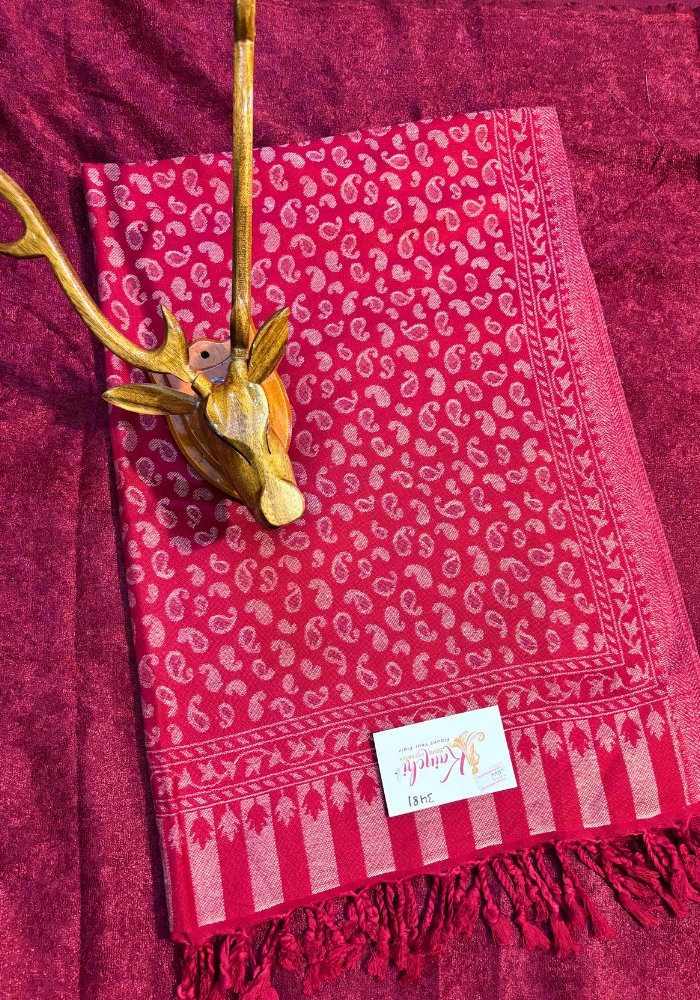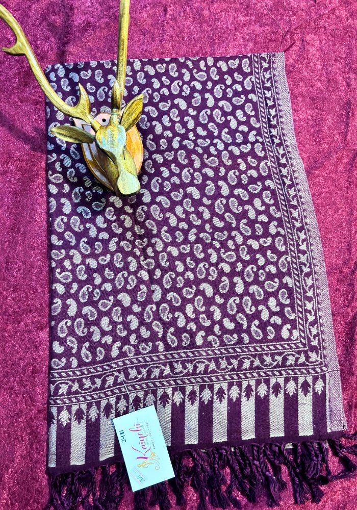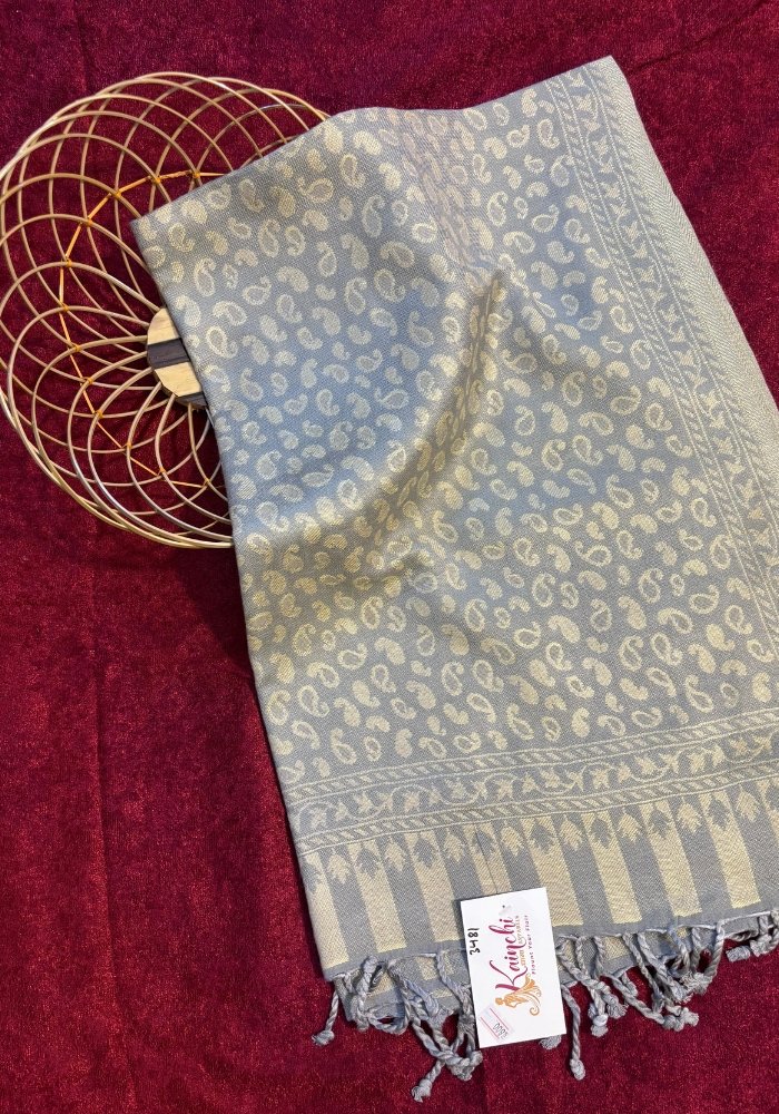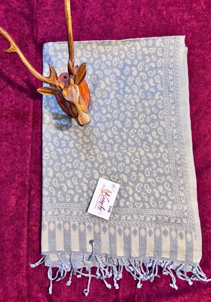 Add subtle elegance to your wardrobe with this Kaju Design Stole from Kainchi Dhaaga. Crafted in a soft grey base, this stole features delicate all-over kaju (paisley) motifs woven in a classic tone-on-tone pattern, reflecting minimal Kashmiri-inspired artistry. Lightweight, soft, and graceful, it is perfect for daily wear, office styling, and refined festive looks.