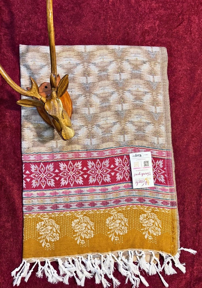Enhance your winter styling with this Mauve Kashmiri Woven Shawl from Kainchi Dhaaga. Crafted in soft mauve and dusty pink tones, the shawl features elegant geometric and floral-inspired woven patterns, complemented by a richly detailed traditional border. Subtle shimmer accents add a refined charm, making it perfect for festive occasions as well as graceful everyday wear.