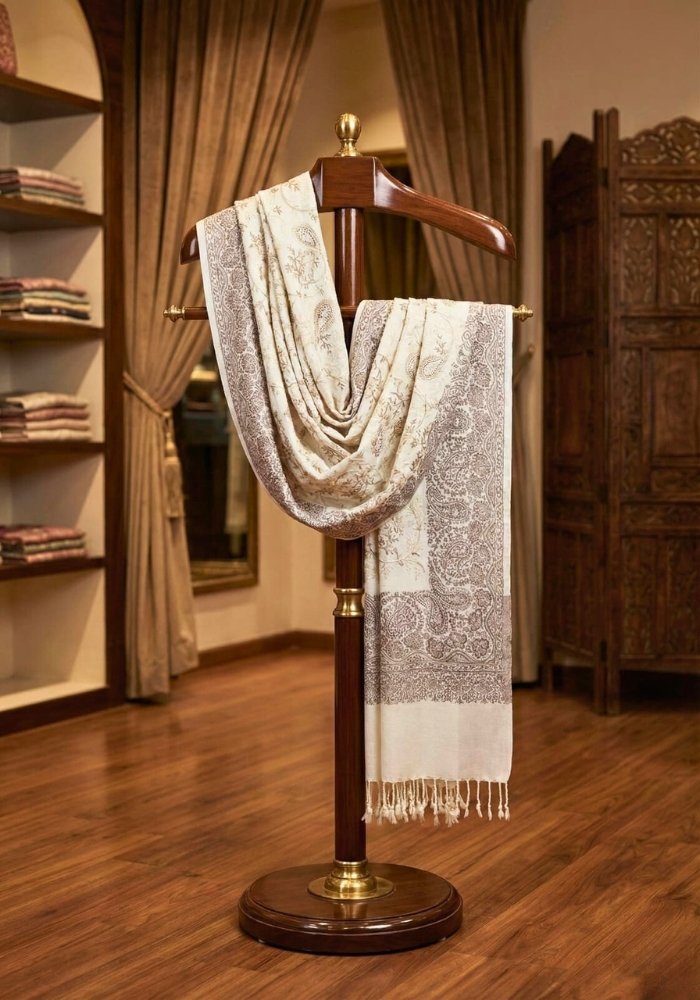 Designed in an elegant ivory cream base, the shawl is embellished with heavy zardozi embroidery in champagne gold tones, creating a refined and luxurious aesthetic. The intricate motifs and delicately finished borders reflect exquisite craftsmanship, making this shawl an ideal choice for weddings, formal gatherings, and festive winter occasions.