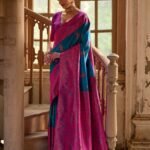 Elevate your festive wardrobe with this breathtaking Teal Blue & Rani Pink Banarasi Silk Saree, crafted for women who appreciate elegance with a touch of royalty. The saree showcases a bold teal blue body, beautifully complemented by a luxurious rani pink border and pallu intricately woven with traditional dancer and celebration motifs.