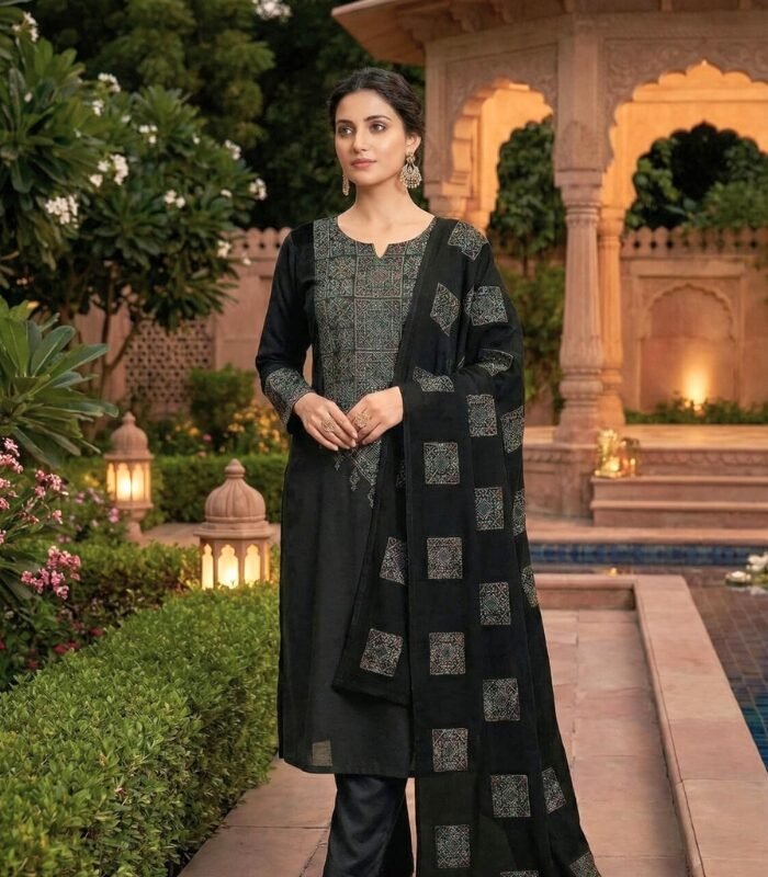 A luxurious woollen velvet 3-piece suit set with top, bottom, and stole—designed for elegant winter festive wear.