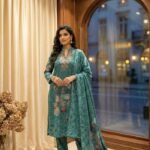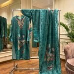 Step into refined winter luxury with this Woollen Velvet Suit 3 Pc Set from Kainchi Dhaaga. Designed in a rich teal green shade, this elegant ensemble features a beautifully detailed velvet-finish woollen top, coordinated bottom, and a matching stole adorned with subtle floral motifs. Soft, warm, and graceful, this suit set is perfect for evening gatherings, festive celebrations, and winter occasions.