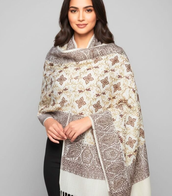 Jannat 1 Embroidered Full Kashmiri Jaal Wool Shawl Ivory & Walnut Brown