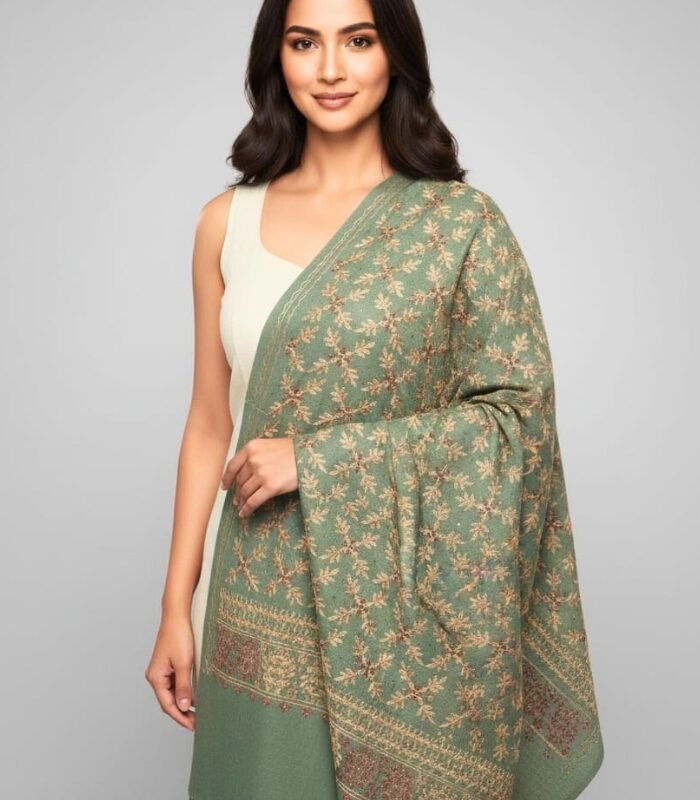 Jannat 2 Embroidered Full Kashmiri Jaal Wool Shawl Sage Green & Antique Gold