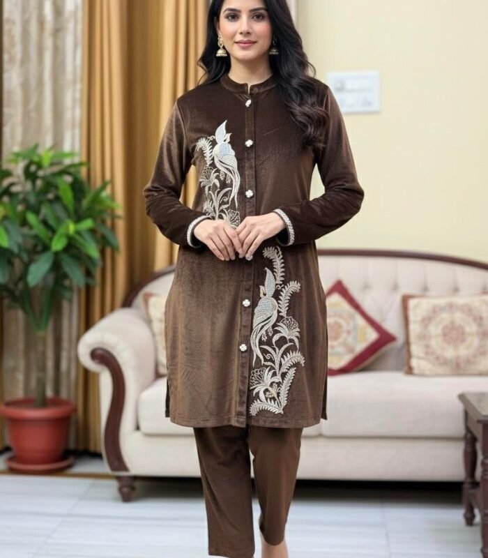 Velvet Coord Set with Embroidered Detailing (Golden Brown)
