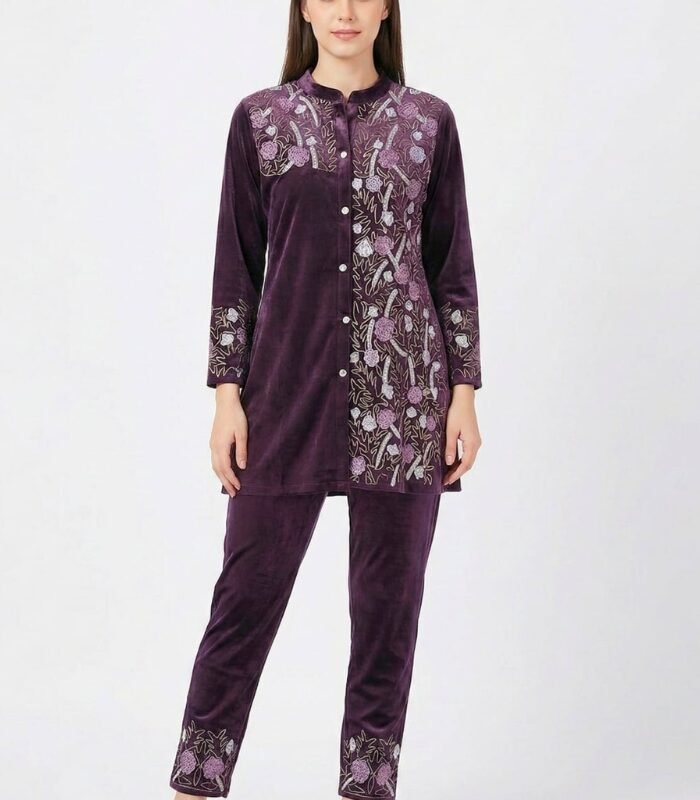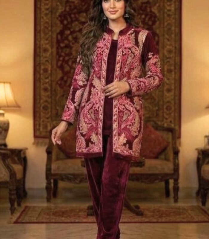Velvet Co-ord Set with Resham Embroidery – Wine Color