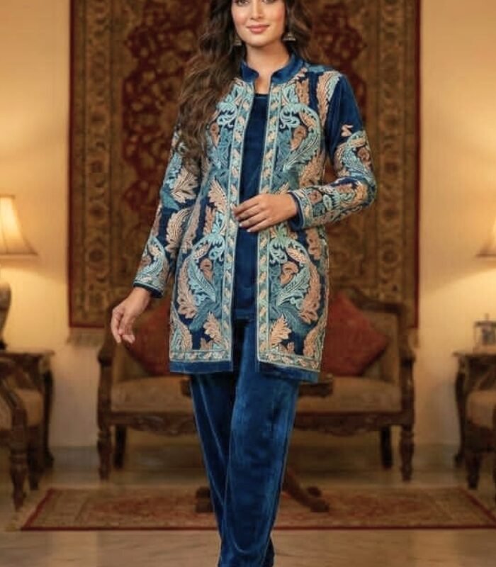 Velvet Co-ord Set with Resham Embroidery – Blue Color